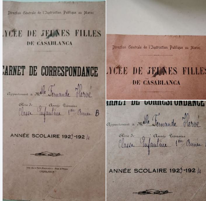 Merci à tous pour vos réponses et partages, le carnet s’envole lundi pour rejoindre la famille de Fernande. bonjour, j’ai trouvé ce carnet de correspondance de 1923/24, 100ans, du lycée de jeune fille a Casablanca et qui appartenait a Melle Fernande Hervé. Si des membres de sa famille veulent le récupérer ce sera avec plaisir